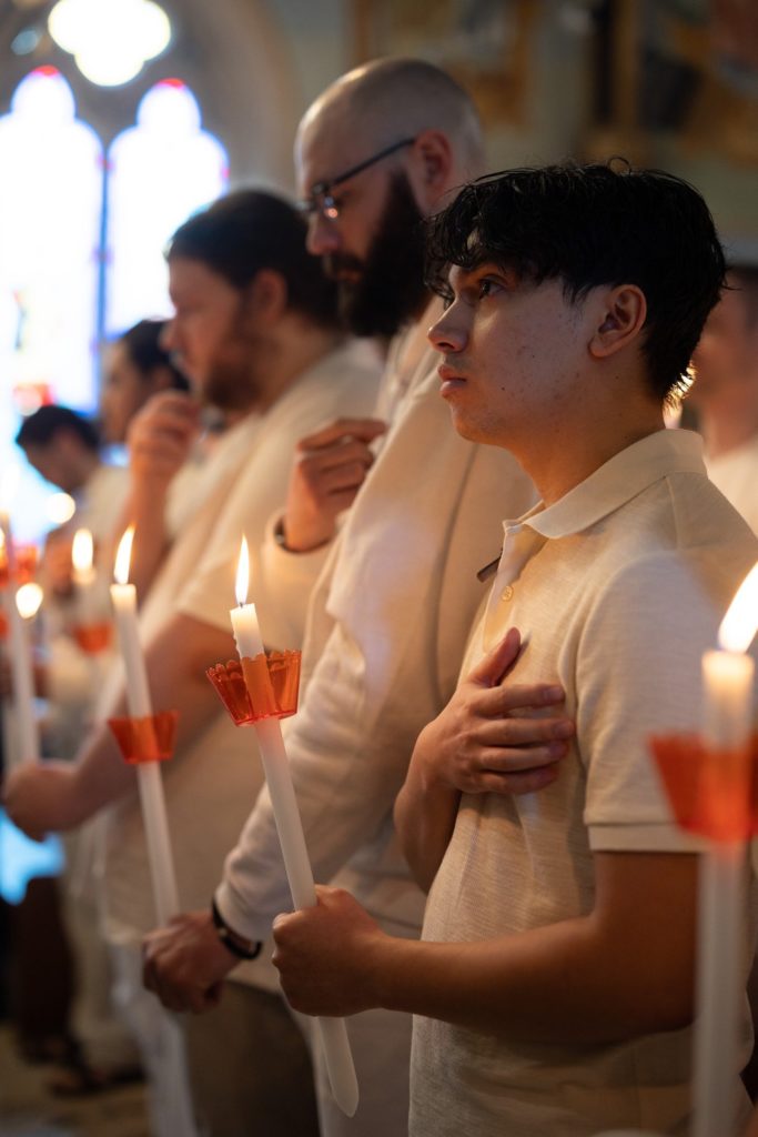 Μετά το πέρας του μυστηρίου, οι νεοφώτιστοι εισήλθαν στον κυρίως ναό κρατώντας αναμμένες λαμπάδες και συμμετείχαν στην Πανηγυρική Θεία Λειτουργία, κοινωνώντας για πρώτη φορά των Αχράντων Μυστηρίων.
